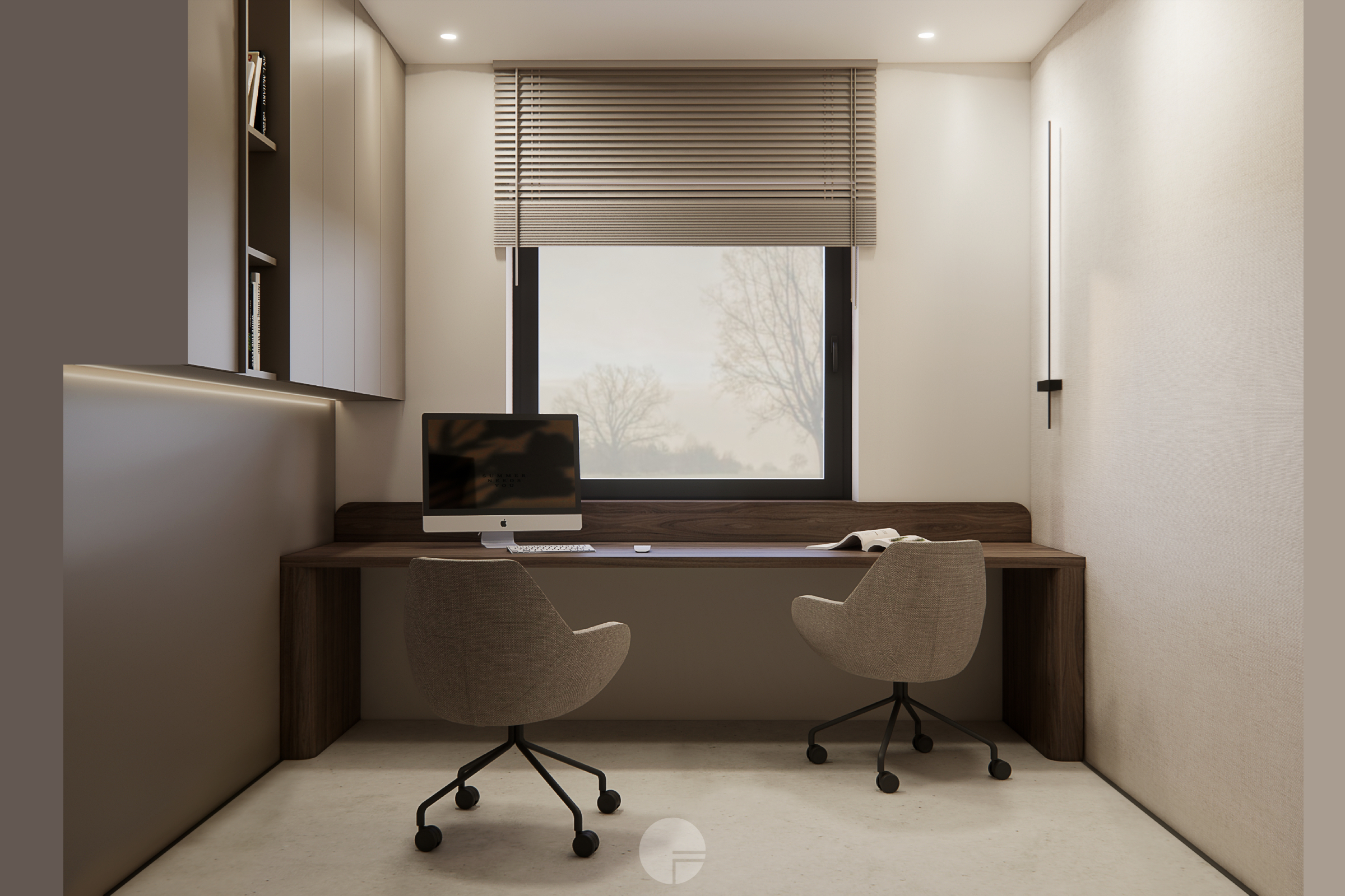 Gabinet: to spokojna przestrzeń pracy zaprojektowana w duchu minimalizmu. Długi blat z ciemnego drewna został wkomponowany w zabudowę meblową, tworząc wygodne miejsce do pracy dla dwóch osób. Wbudowane półki i szafki pozwalają zachować porządek i klarowność przestrzeni, tak ważną w stylistyce Japandi. Naturalne światło z dużego okna sprzyja koncentracji i codziennej pracy.