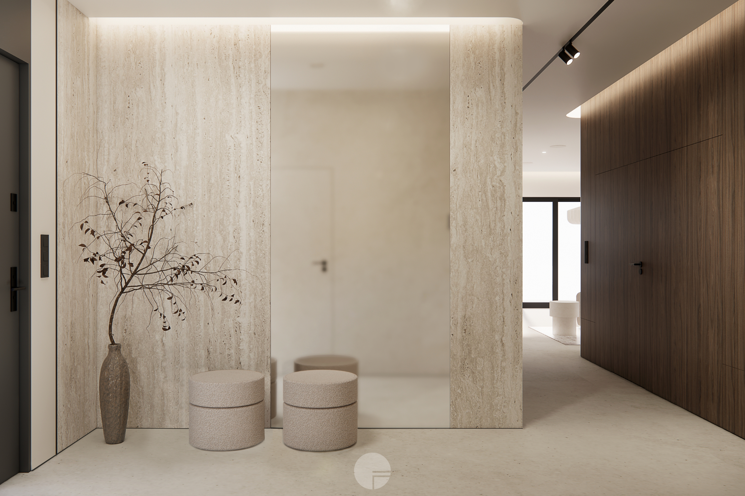 Hol: wprowadza w klimat projektu Elegancki Dom Japandi, gdzie pierwszoplanową rolę odgrywają naturalne materiały i spokojna paleta kolorów. Ściany wykończone tynkiem glinianym zestawiono z zabudową z ciemnego drewna, która kryje funkcjonalne schowki na odzież i akcesoria. Duże lustro optycznie powiększa przestrzeń, a delikatne oświetlenie liniowe podkreśla strukturę materiałów. Całość tworzy uporządkowaną i spokojną strefę wejścia.