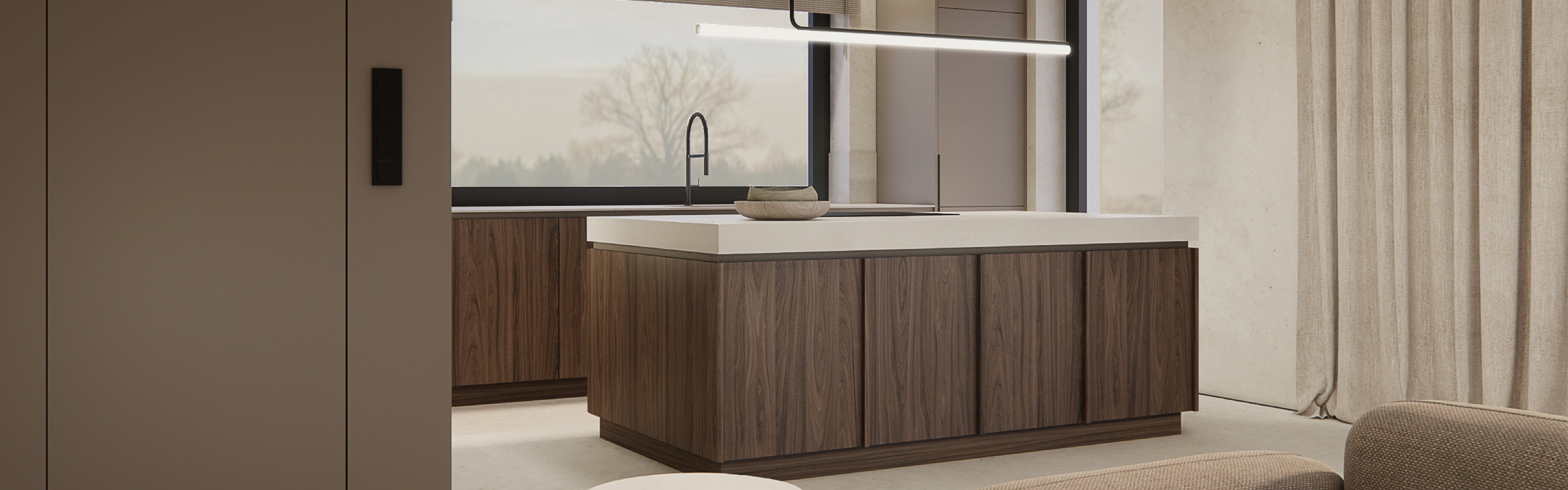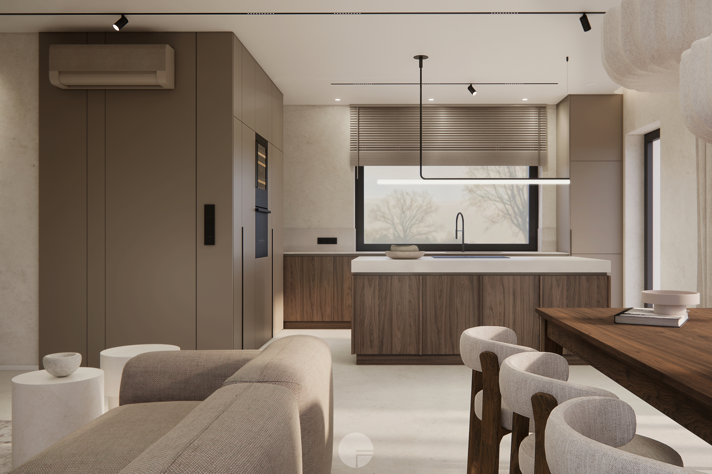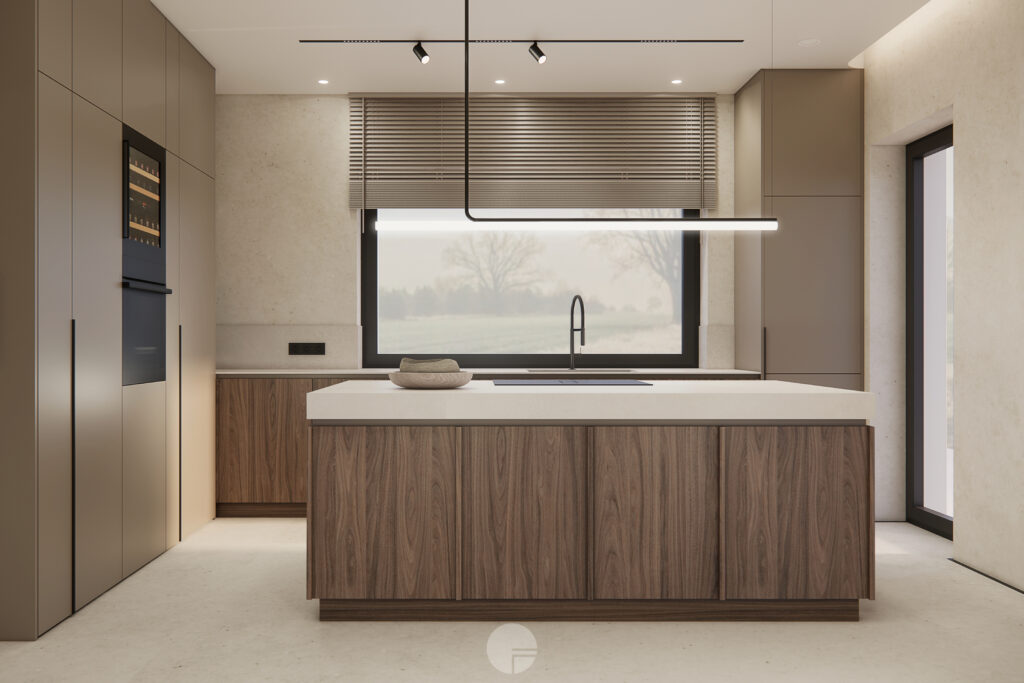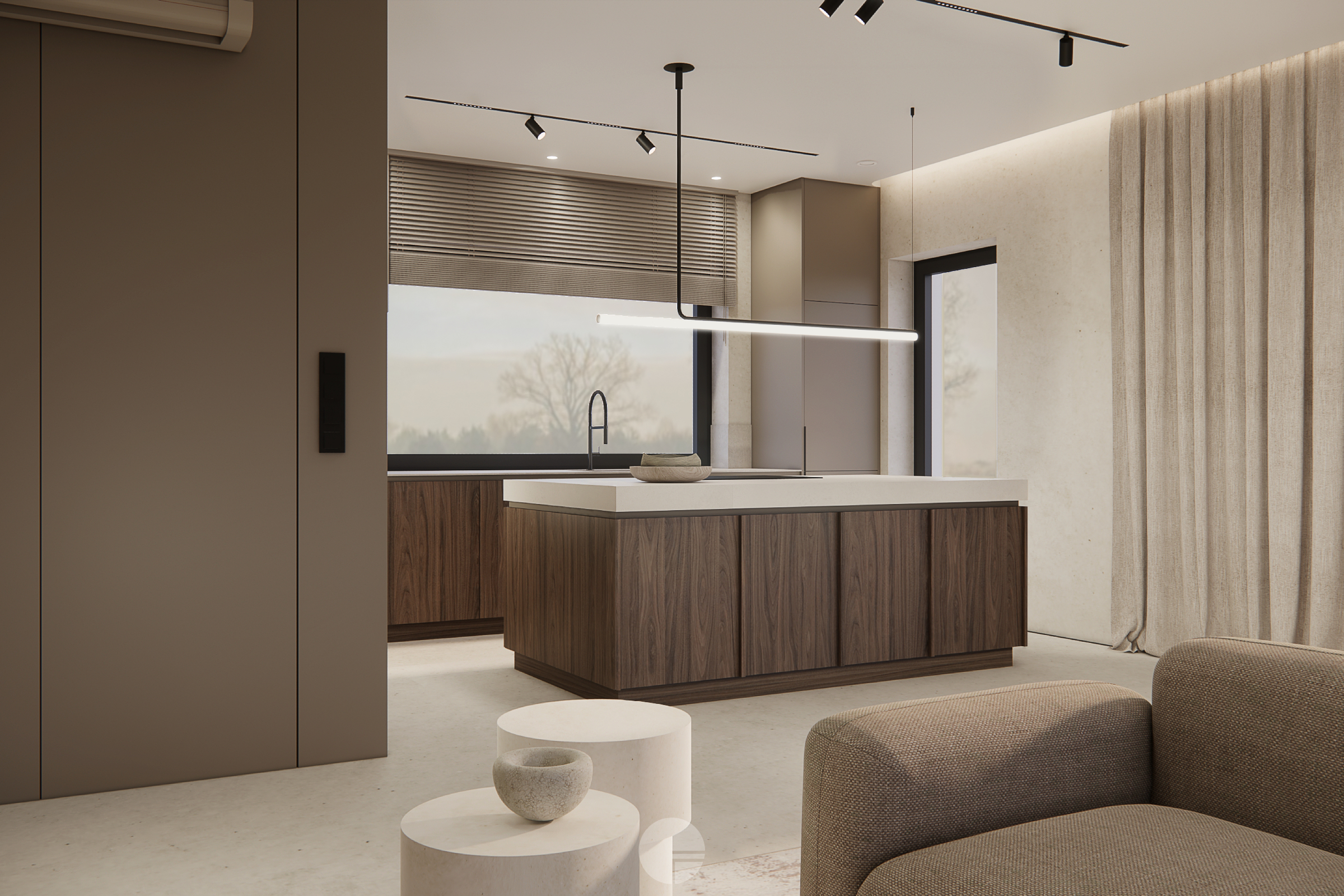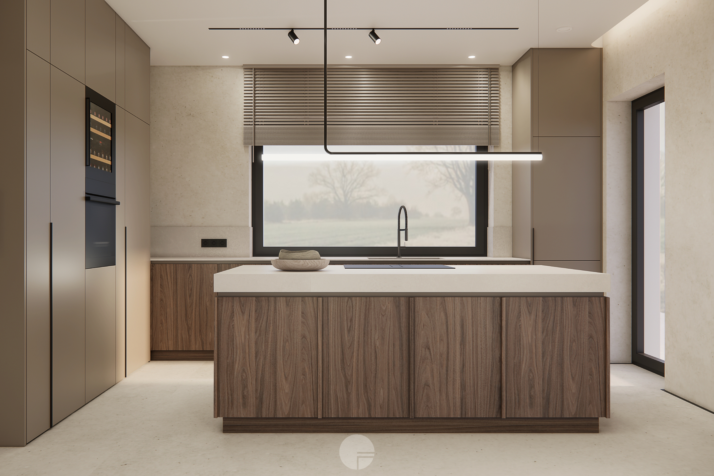 Kuchnia: została zaprojektowana jako minimalistyczna, uporządkowana przestrzeń robocza. Zabudowę w stonowanym odcieniu uzupełnia wyspa z frontami z ciemnego drewna, która pełni funkcję zarówno blatu roboczego, jak i miejsca spotkań. Jasny blat kontrastuje z drewnem i podkreśla czystą geometrię formy. Duże okno nad zlewem wprowadza naturalne światło i otwiera widok na otoczenie domu.