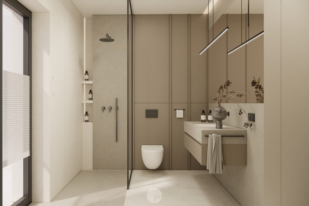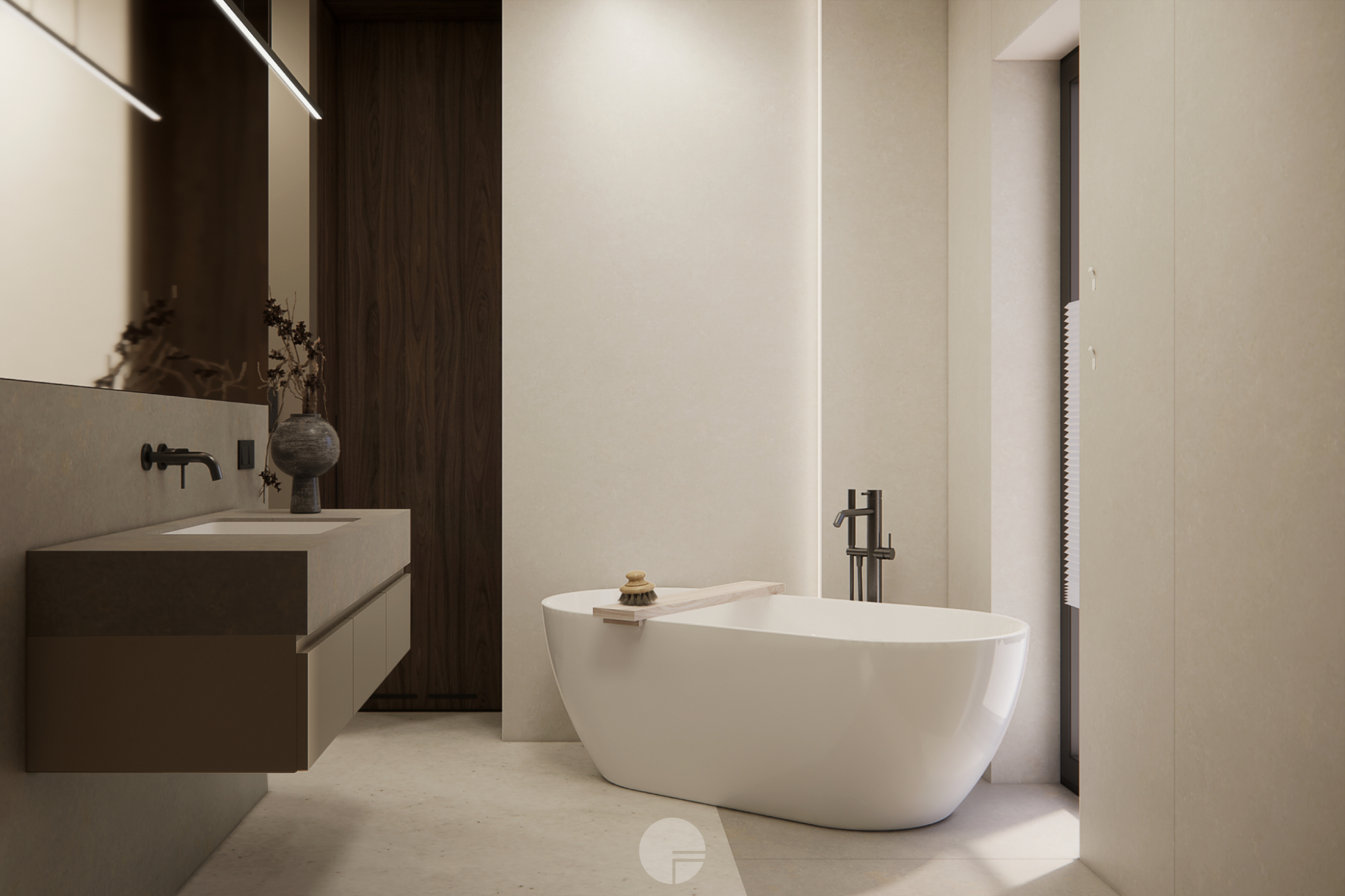 Łazienka: utrzymana jest w spokojnej, naturalnej kolorystyce inspirowanej materiałami ziemi, charakterystycznej dla stylistyki Japandi. Ściany wykończono mineralną strukturą o delikatnej fakturze, która podkreśla organiczny charakter wnętrza i dobrze współgra z prostymi formami wyposażenia. Strefę umywalki tworzy prosta bryła blatu zintegrowanego z szafką oraz duże lustro, które optycznie powiększa przestrzeń. Obok znajduje się wolnostojąca wanna o miękkiej, organicznej formie oraz strefa prysznica z lekką, szklaną przegrodą, dzięki czemu całość pozostaje minimalistyczna i sprzyja codziennemu relaksowi.