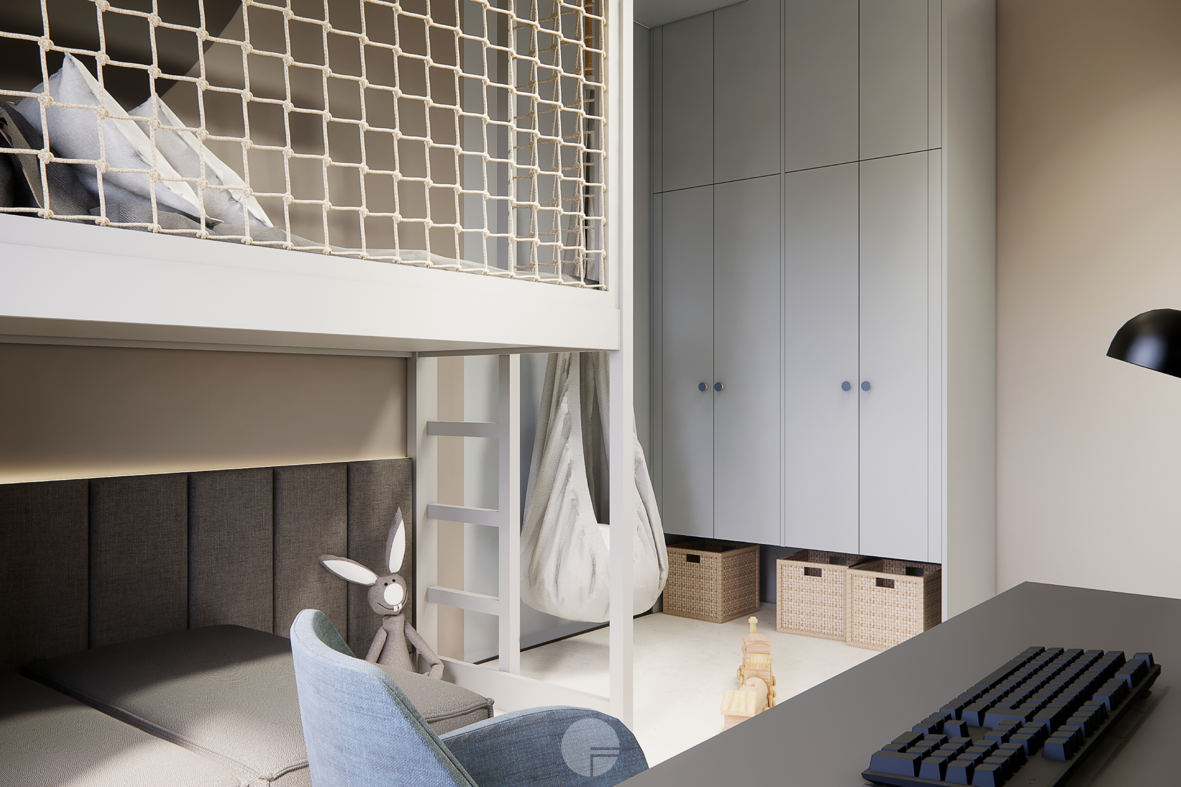 Pokój chłopca: zaprojektowano jako funkcjonalną przestrzeń do zabawy i odpoczynku. Piętrowe łóżko z zabezpieczającą siatką pozwala optymalnie wykorzystać przestrzeń, pozostawiając miejsce na strefę zabawy. Wbudowana szafa oraz kosze do przechowywania pomagają utrzymać porządek w codziennym użytkowaniu. Neutralna kolorystyka i naturalne materiały sprawiają, że wnętrze rośnie razem z dzieckiem.