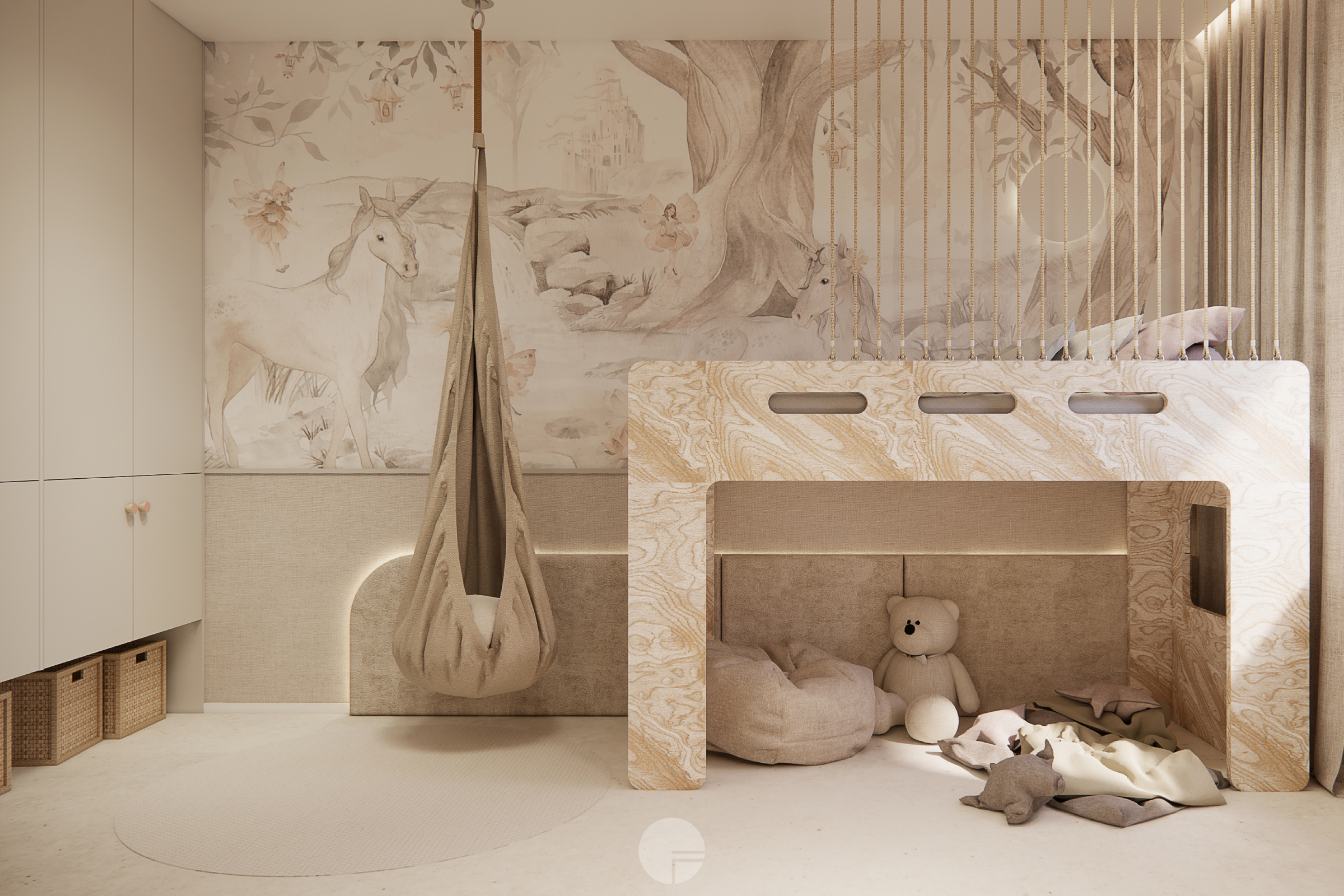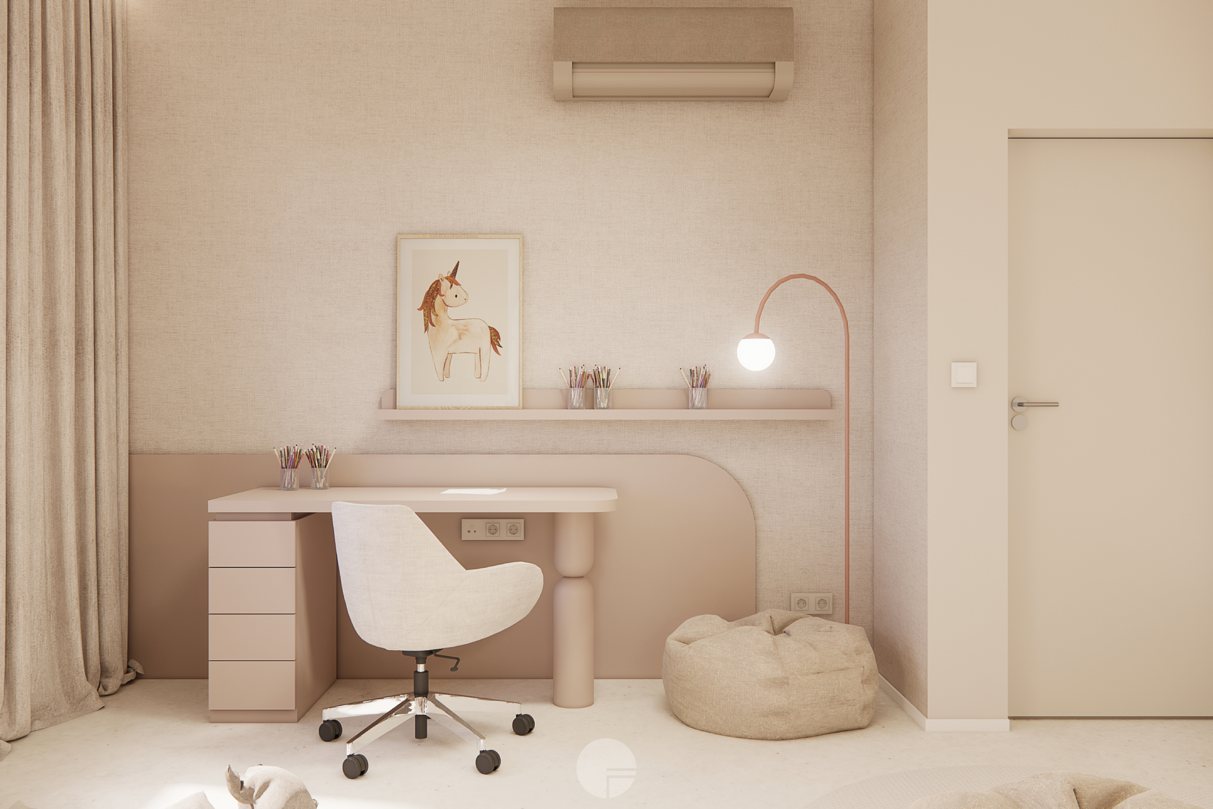 Pokój dziewczynki: utrzymany jest w jasnej, pastelowej kolorystyce, która wprowadza lekkość i delikatność. Funkcjonalne biurko z wbudowanymi szufladami oraz półką na ścianie tworzy wygodne miejsce do nauki i kreatywnej pracy. Miękkie tekstylia oraz subtelne oświetlenie budują przytulny charakter wnętrza. Całość pozostaje spójna z koncepcją Eleganckiego Domu Japandi, zachowując prostotę i naturalne materiały.