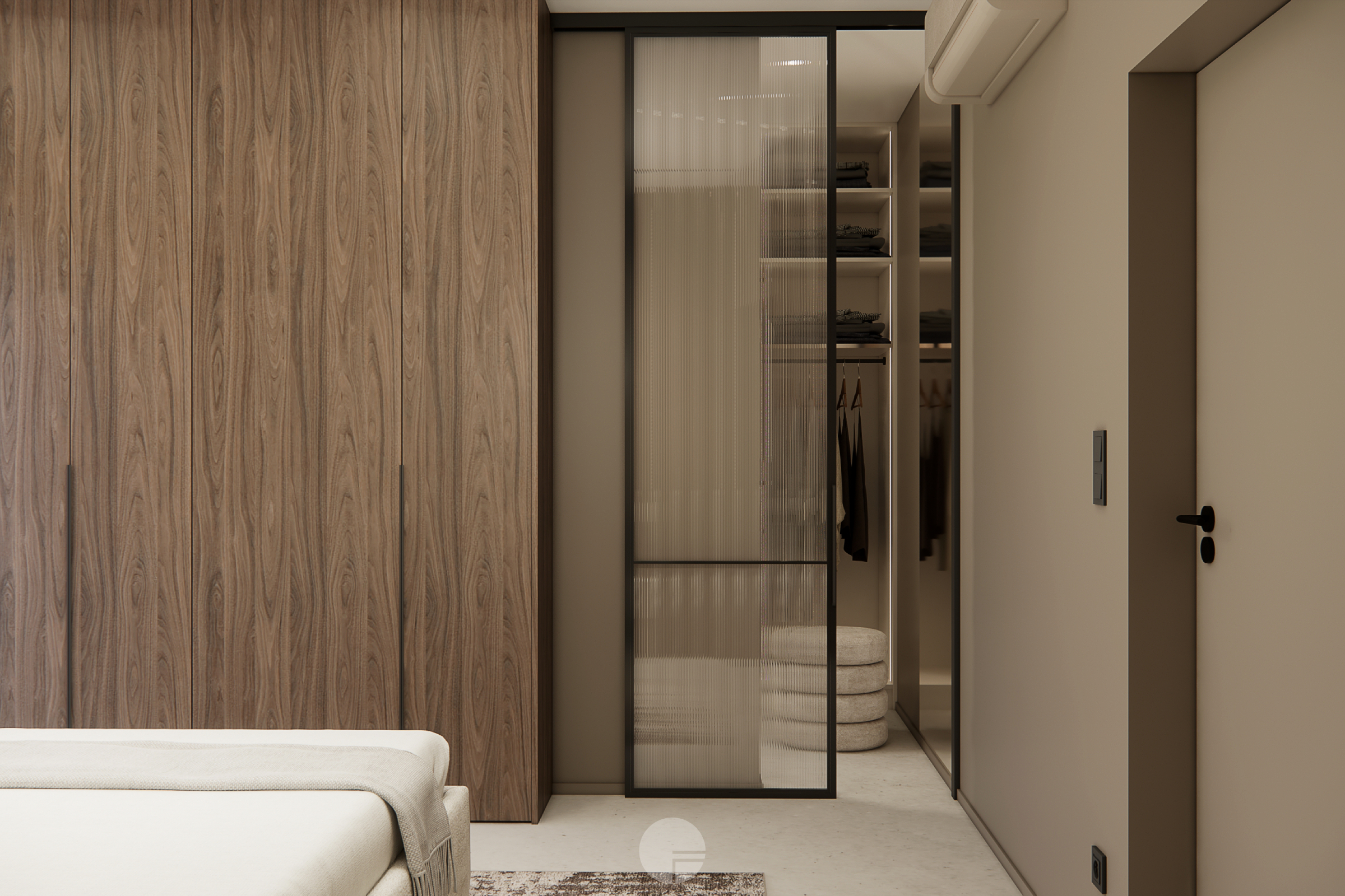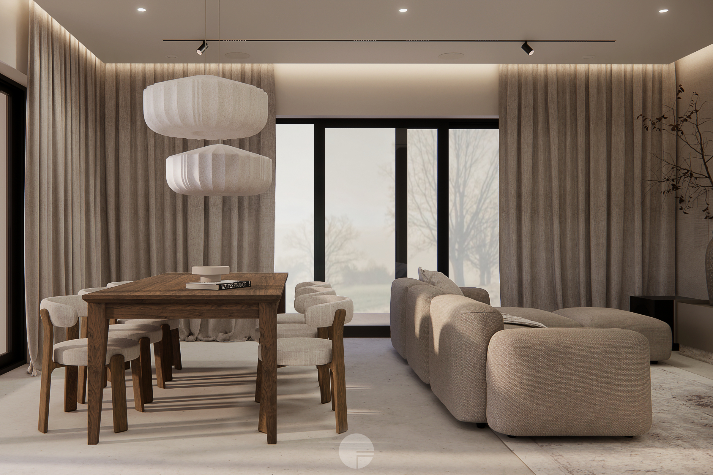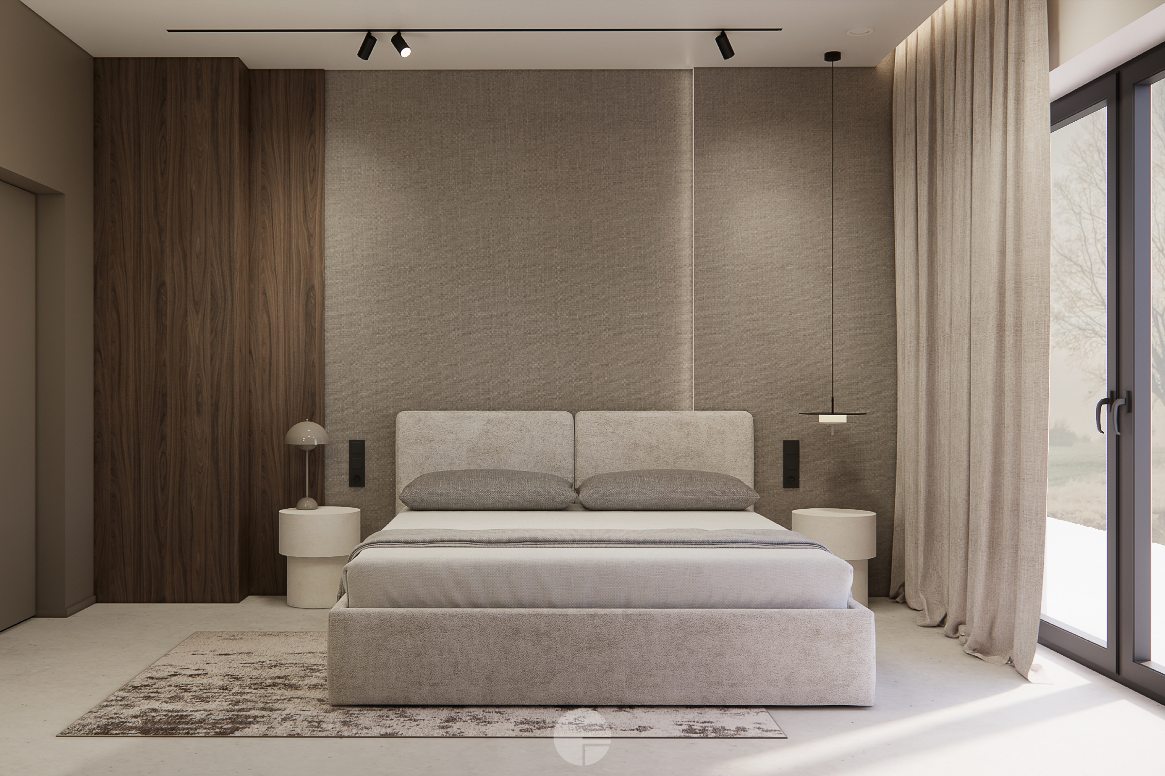 Sypialnia: to przestrzeń zaprojektowana z myślą o spokoju i regeneracji. Centralnym punktem jest tapicerowane łóżko o prostej, niskiej formie, ustawione na tle ściany wykończonej naturalną tkaniną i drewnianym panelem. Po obu stronach znalazły się minimalistyczne stoliki nocne i subtelne oświetlenie, które tworzą przytulną atmosferę wieczorem. Duże przeszklenia oraz jasne zasłony pozwalają miękko filtrować światło dzienne.