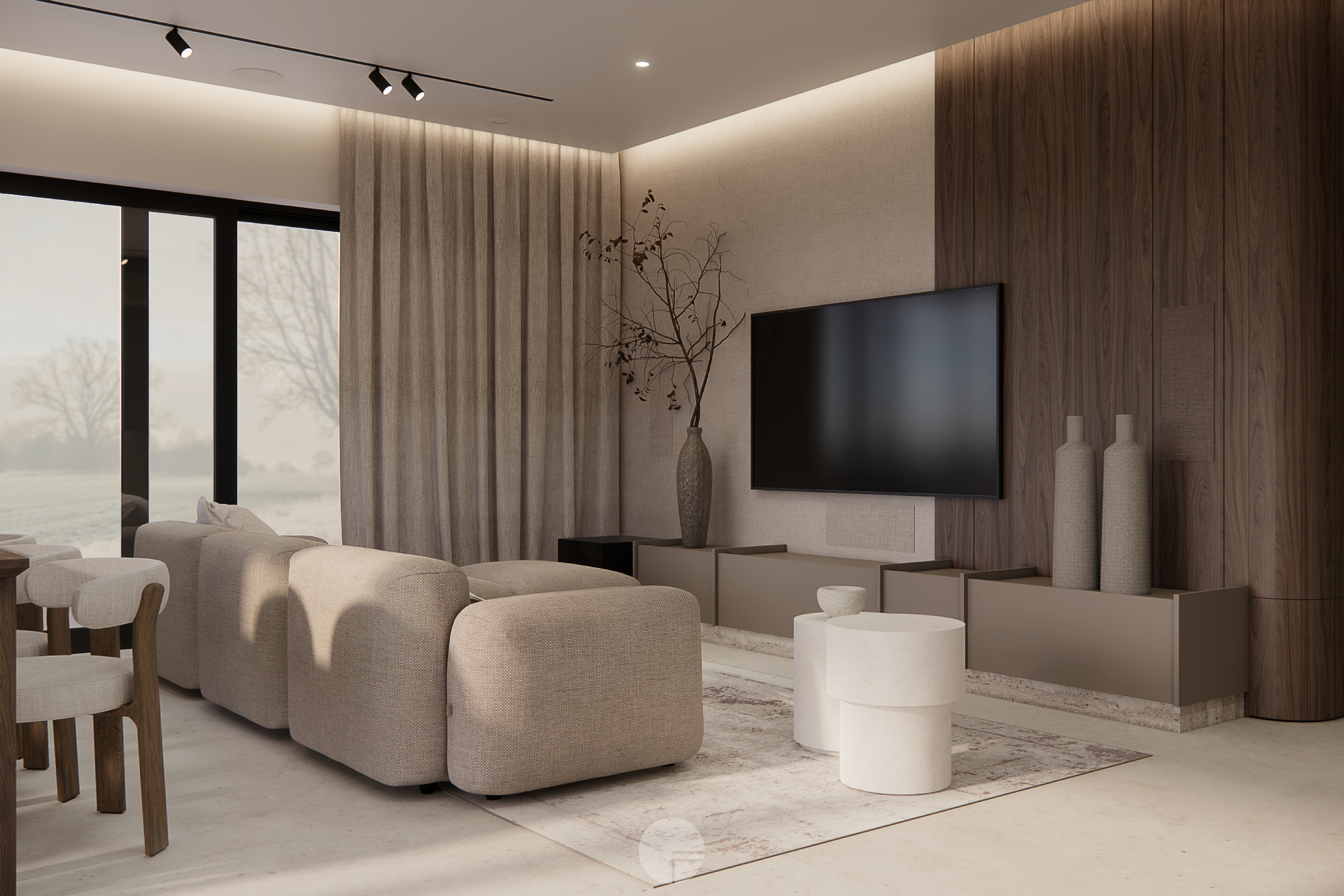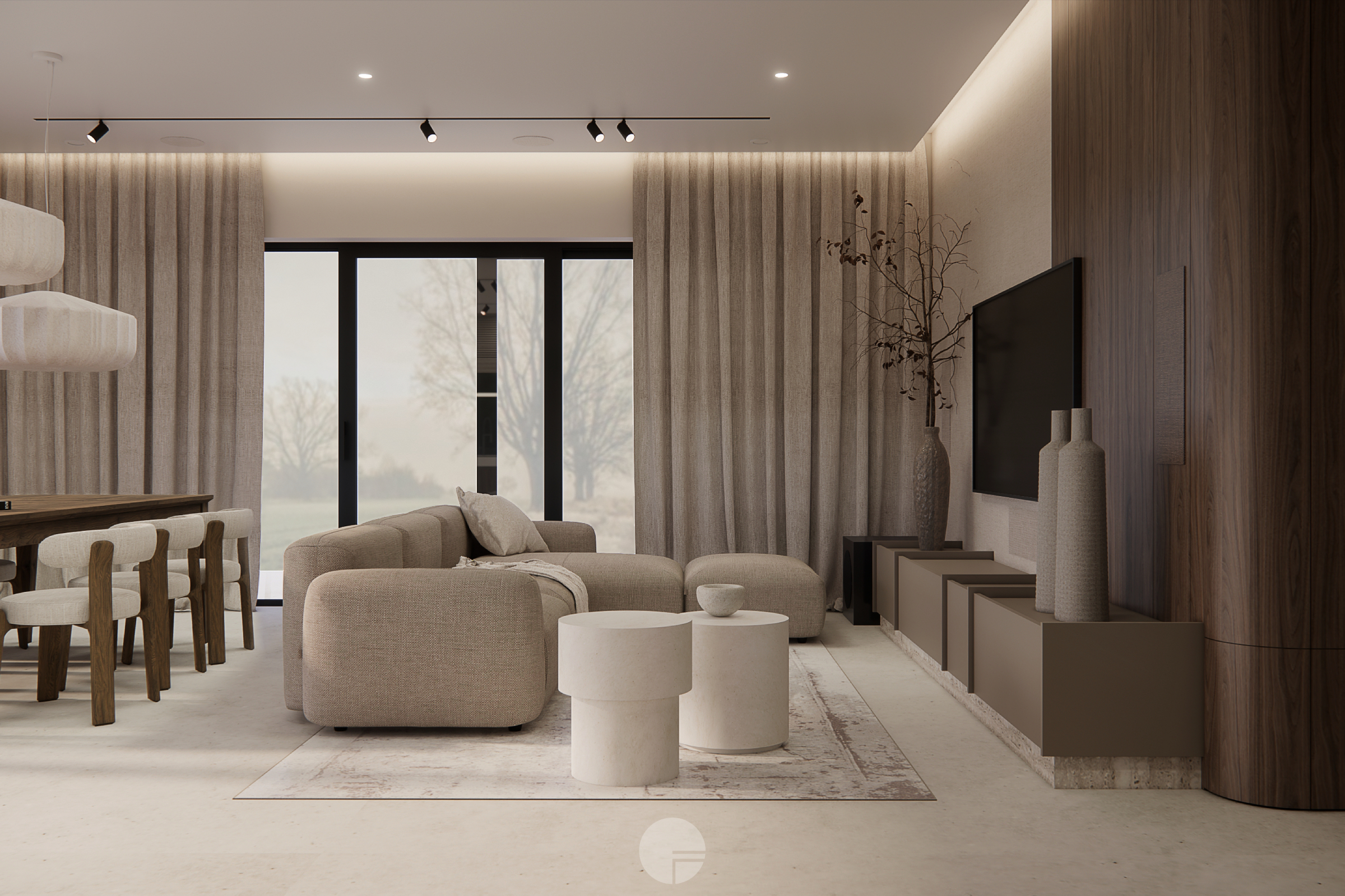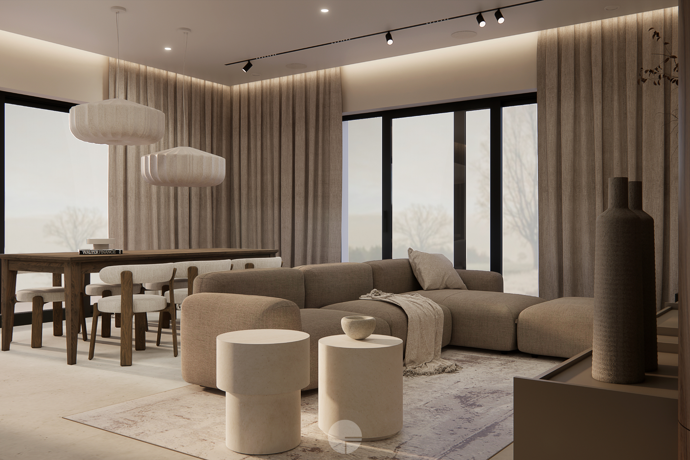Sypialnia: to przestrzeń zaprojektowana z myślą o spokoju i regeneracji. Centralnym punktem jest tapicerowane łóżko o prostej, niskiej formie, ustawione na tle ściany wykończonej naturalną tkaniną i drewnianym panelem. Po obu stronach znalazły się minimalistyczne stoliki nocne i subtelne oświetlenie, które tworzą przytulną atmosferę wieczorem. Duże przeszklenia oraz jasne zasłony pozwalają miękko filtrować światło dzienne.